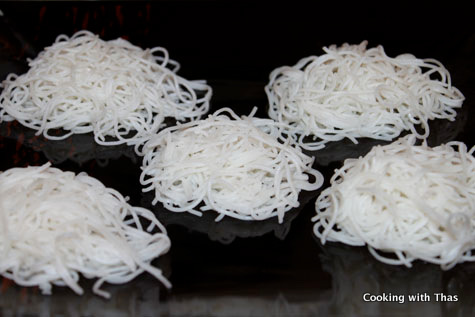 Recently, as part of my husband’s Gluten free diet I had to stack up Rice Vermicelli in my pantry, just in case if I get lazy I can make a quick fix noodles at least. Yesterday, while making Chicken Noodle Salad with spicy Asian dressing the idea of making idiyappam using rice vermicelli triggered my mind. I patted myself for this idea, yet I was a bit concerned whether it would have the look of idiyappam. Nevertheless, I did reserve some cooked rice vermicelli in the refrigerator for transforming it into idiyappam the next day.