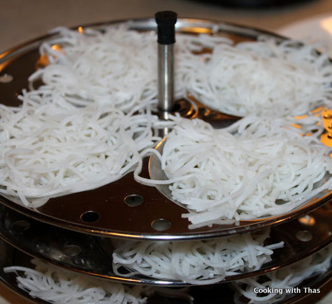 - If you don’t have the Idiyappam plates, you could just spread the vermicelli on small steel flat plates and steam cook it.