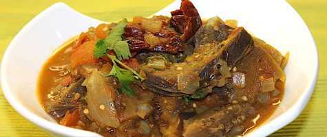 Eggplant or brinjal is combined with aromatic spices and cooked with tamarind extract. To impart the sweetness, jaggery or palm sugar is added. If you don’t have jaggery, you could use brown sugar instead.