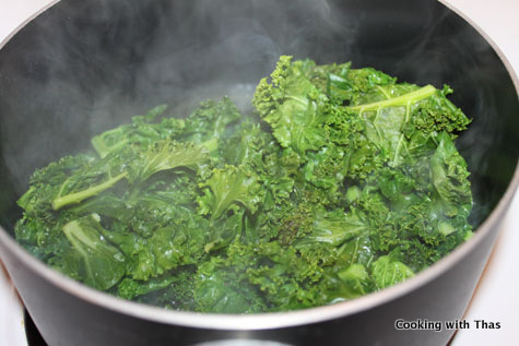 - Place a non-stick pan over medium heat, add the chopped kale and cook till it wilts without adding water, keep aside.