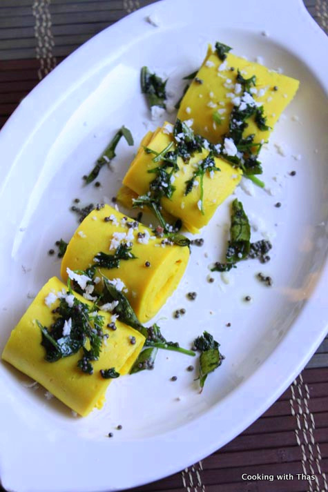 Making the perfect khandvi is quite an art and needs patience and practice to master it. However, the key factors are constantly stirring the batter and the cooked batter should have the right constituency to spread it on the plates. This was the first time I made khandvi, luckily it turned out soft and tasted good as well.