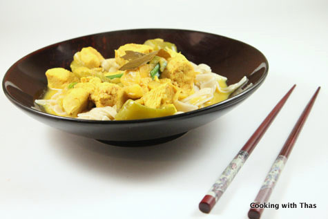 - While serving, place some cooked rice noodles or egg noodles in a bowl and add the chicken along with the gravy over the noodles.