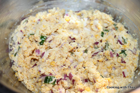 - To a large bowl, add the ground chana dal, 1 tbsp soaked chana dal, chopped small onion, grated ginger, chopped curry leaves, chopped green chilies, asafoetida, fennel seeds & salt.