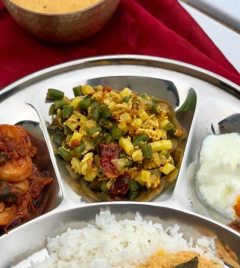 Kerala style lunch: rice, shrimp roast, beans thoran and yogurt/pickle