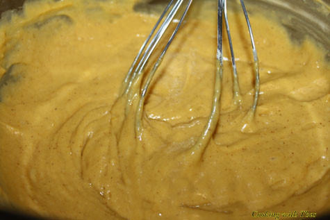 - Whisk in the eggs, mango pulp, ground cinnamon, vanilla extract, baking powder, baking soda and salt.