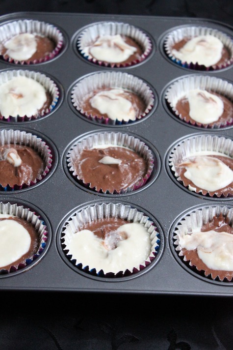 10. First, pour some chocolate batter & then top with some vanilla batter.