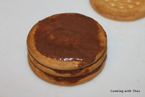 - Spread chocolate frosting, layer with another marie biscuit and repeat this.
