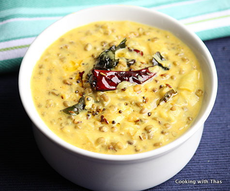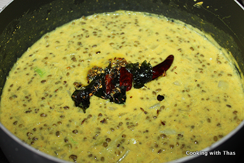 - Remove the pan from the heat and pour the seasoning over the prepared mung bean and cabbage kadhi. Keep the mixture covered for a few minutes.