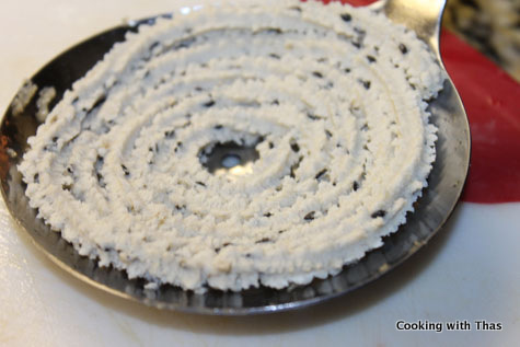 - Make the murukku on a greased slotted spoon, this way it's easy to add into the frying pan and prevents breaking of the dough while transferring to the frying pan.