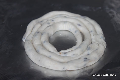 - Place any bottle lid on the wooden board, rotate the dough rope around the lid till you have 3 or 4 layers. Make sure the layers are close to each other else it will separate while frying.