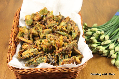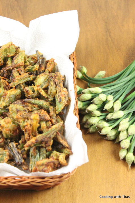 You can find a lot of Indian recipes using okra. The other day, while searching for a kool okra recipe, I came across Vahchef’s Okra Jaipuri. It was an easy recipe and hence thought of trying it. I had chives too, so used both okra and chives to make the fritters. You could use just the okra.