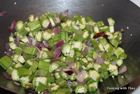 - Add grated coconut and stir fry over high heat till okra & coconut turns light golden brown in color.