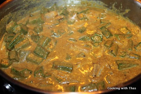 - Once the okra has turned soft, add the ground coconut paste, combine well.