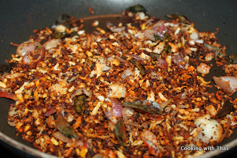 I love anything that’s made with roasted coconut. In Kerala, there a lot of curries made with roasted coconut: fish curries, veggie curries etc. In fact, most of the Kerala veggie dishes have coconut added to it. Don’t be surprised as Kerala is the land of coconuts. Also, most of the curries can be also made without roasting the coconut, just by adding the ground coconut paste. However, by roasting the coconut along with some spices and then pureeing it to a paste and combining it with fish or veggies enhances the taste of that dish greatly. Whoever has tried both the versions would definitely agree with me.