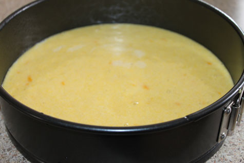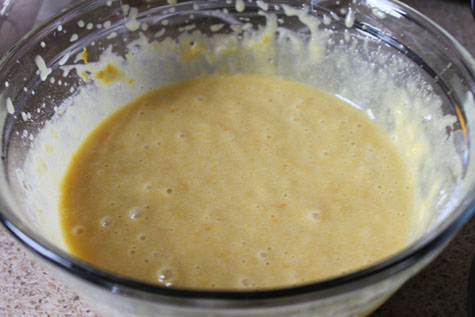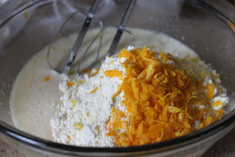 - Add all purpose flour, cornmeal, baking powder, salt, and orange zest to the wet ingredients.