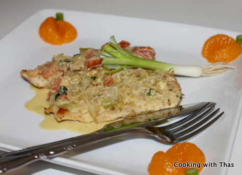 I tweaked the original recipe a bit. The original recipe called for fish, but I used chicken. Also, I used dried oregano and ground pepper to season the all-purpose flour which gave a good flavor to the pan-fried chicken. The recipe involves two steps: pan frying the chicken and preparing a coconut sauce. The creamy coconut sauce is then poured over the pan fried chicken. The creamy coconut sauce has a mild flavor with all the spices added in it. For the second dish, I made pasta and poured the coconut sauce over it. Pasta tasted really good with the sauce.