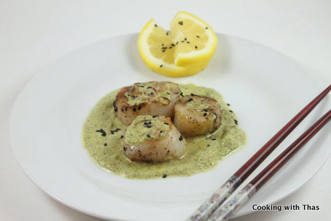 Sesame Scallops in Creamy Asparagus Saffron Sauce