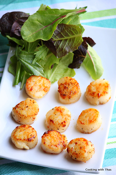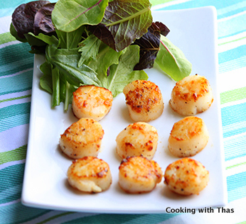 The key about cooking delicious scallops is that it shouldn’t be over seasoned. Season them with just salt and ground pepper and pan sear them in butter. They would turn delicious and can be served with salads or can be served as an appetizer.