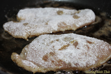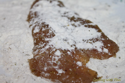 - Spread the all purpose flour on a plate. Dip the chicken in the flour and coat all over the chicken with the flour. Shake off the excess flour.