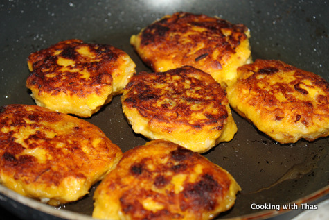 - Place the flattened plantain cutlet over the oil/ghee and pan fry till both sides turn golden brown.