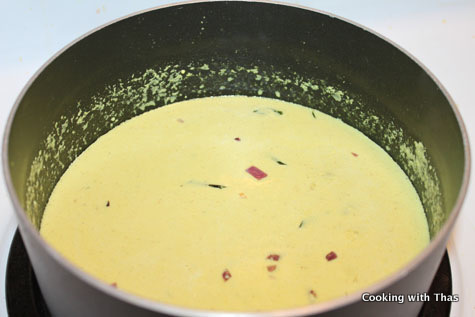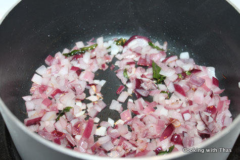 - Add onion, curry leaves and little salt, saute till onion starts to turn golden in color.