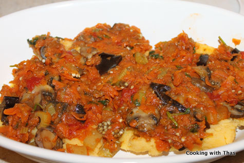 Once in a while I love to indulge in lasagna loaded with ground beef and cheese. It’s been a long time since I made lasagna as I don’t feel like making it for myself. A few months ago, I got introduced to polenta and was relieved by the fact that it’s made with cornmeal so that my better half can enjoy it too. I had made a few dishes with polenta, once I stir fried it with veggies, another time I pan fried the polenta with some seasoning. For some, plain polenta might taste very blant, but you could always enhance its flavor by adding some seasonings, spices, cheese etc.