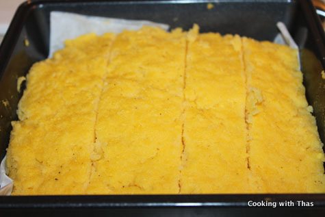 - Grease little butter on the parchment paper and evenly spread the polenta using a spatula.