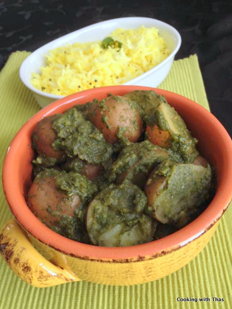 Two of my favorite veggies: spinach and potato got married into one dish. This is in deed a healthy and a pleasing dish. The fleshy potatoes gives a meat feeling and the pureed spinach enhances the taste and the flavor of this dish. This is one of the popular vegetarian dishes in North India.