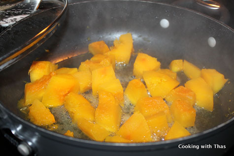 - Dice the pumpkin. In a large pan, cook the pumpkin covered along with 1/2 cup water till it’s fork tender.
