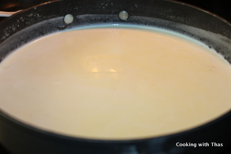 - Add heavy cream, sugar and vanilla extract into a large saucepan, heat it over medium heat.