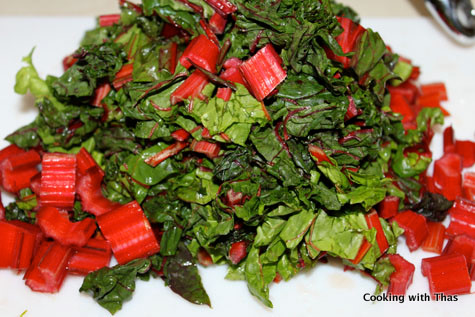- Thoroughly wash the red swiss chard under running water; coarsely chop the leaves and cut the stems small.