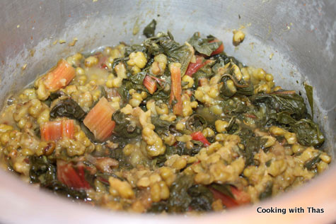 - Remove from the flame and pour the seasoning into the cooked dal and red swiss chard mixture.