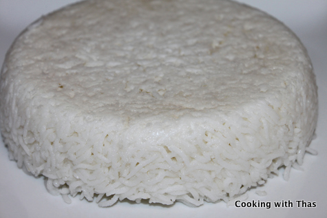 - Cover the rice bowl with a platter and turn upside down, the sesame fried rice would fall on the platter like a cake with the bowl shape.