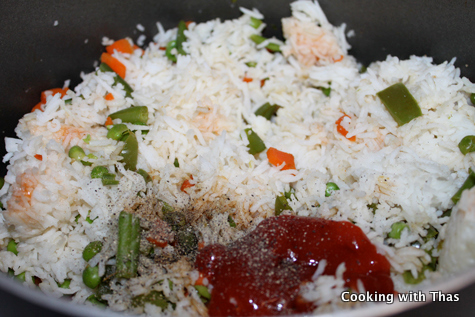 - To the cooked veggies, add the cooked basmati rice and stir fry.