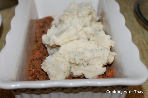 - Drop the mashed potatoes over the filling and spread it evenly using a spatula.