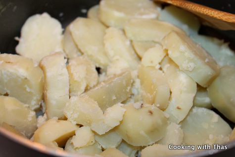 - Cook the potatoes until a fork goes easily into the potatoes.