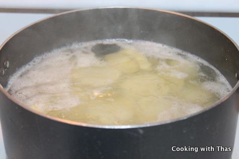 - Place peeled, diced potatoes in a wide sauce pan, cover the potatoes with water and let come to a boil.