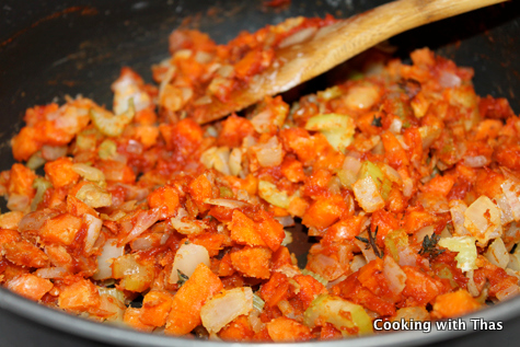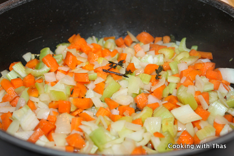 - Heat oil in a wide non-stick pan or dutch oven over medium heat, add carrots, celery, onion and thyme.