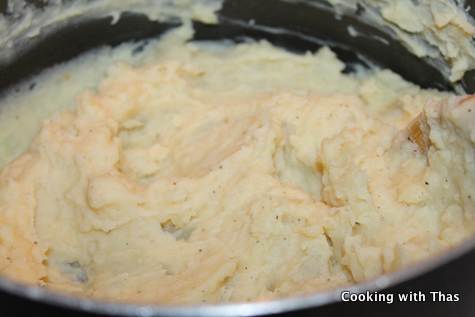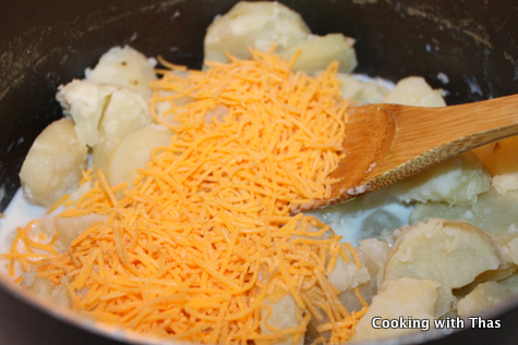 - Add milk and 1 cup cheddar cheese to the potatoes and mash the potatoes until smooth without any lumps using a wooden spoon or potato masher.