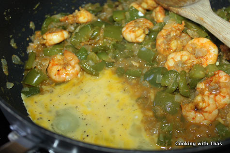- Make some room in the pan and add the beaten egg to it, as it starts to cook scramble it and combine with the shrimp and veggies.