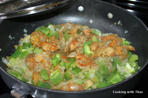 - Add 1/8 cup of water to the bowl in which shrimp was marinated, rinse it and add the water to the pan.
