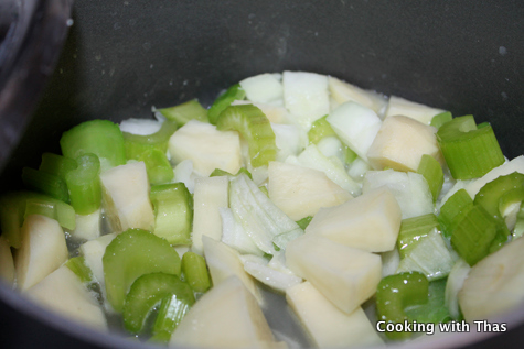 - Add garlic minced, thyme sprigs, potatoes and celery, cook covered till potatoes turn tender.