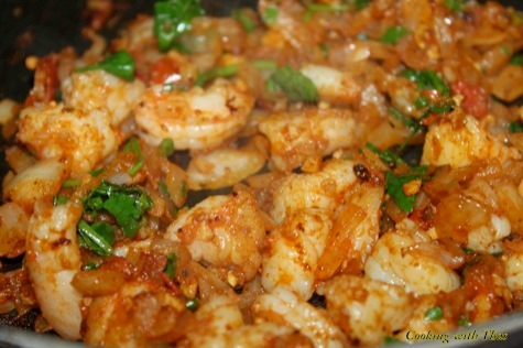 - Now, add the cleaned shrimp along with chili powder, garam masala, turmeric powder, fennel powder, coriander powder, cook the shrimp for a few minutes.