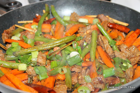 9. Remove the cover, stir fry the beef and veggies until it starts to turn brown in color.