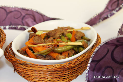 I added whole red chili to the oil to give the dish a spicy flavor and stir fried the thinly cut beef till it started to brown along with the veggies. You get to taste beef and veggies at the same time from the same dish. Now, this is what I call as my kind of dish!