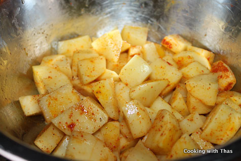 - In a large bowl, marinate the diced potatoes along with chili powder, turmeric powder, ground pepper and salt, keep aside for 10 minutes or longer.