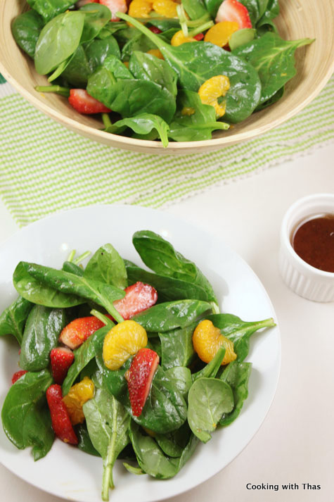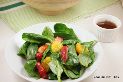 Last night, for dinner I tried to recreate the spinach fruit salad that I had for the potluck. Spinach goes well with fruits and when drizzled with a sweet vinaigrette dressing it would taste delicious. Anyone who dislikes salad would definitely fall for this yummy salad and this is a great way to have your kids eat some spinach.