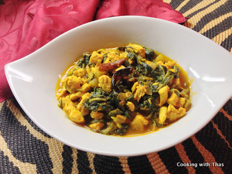 On week days, I get lazy to make more than one dish so I usually prepare a dish using chicken which is served along with pasta or noodles or rice or roti. Most of the time I make sure to add a lot of veggies, greens or lentils to my chicken dish so that one dish has literally everything in it. This is one such dish, you get to enjoy the chicken as well as the spinach. I’ve used boneless chicken breast, so it’s quite a healthy dish and can be served with rice, roti etc.