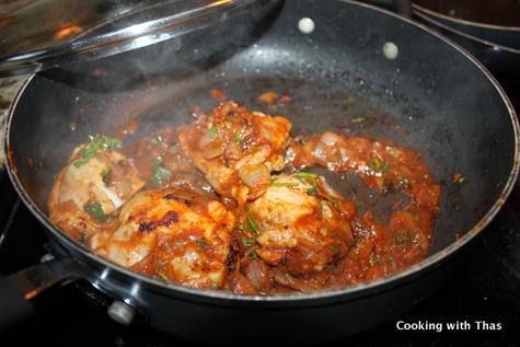- Add onions and curry leaves. Cook covered till chicken has cooked well.