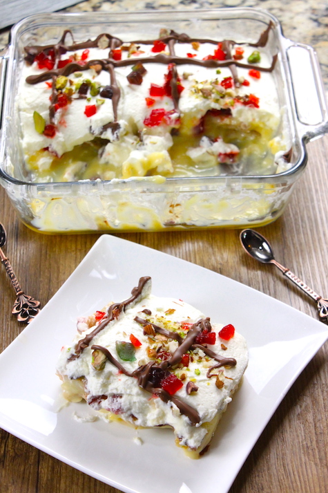 This is easy to whip up & no-bake trifle. Layered with custard pudding, bread & whipped cream, topped with candied dried fruits, nuts & melted chocolate. Tasted out of the world, even those without a sweet tooth will enjoy this trifle.
